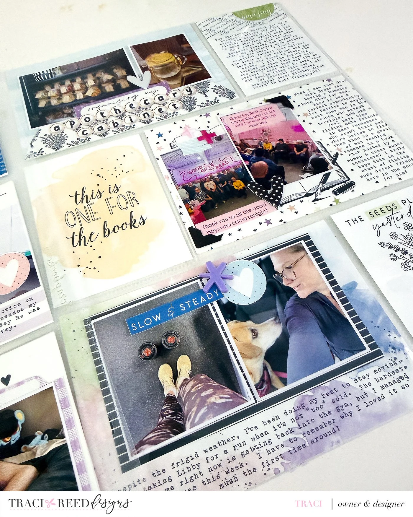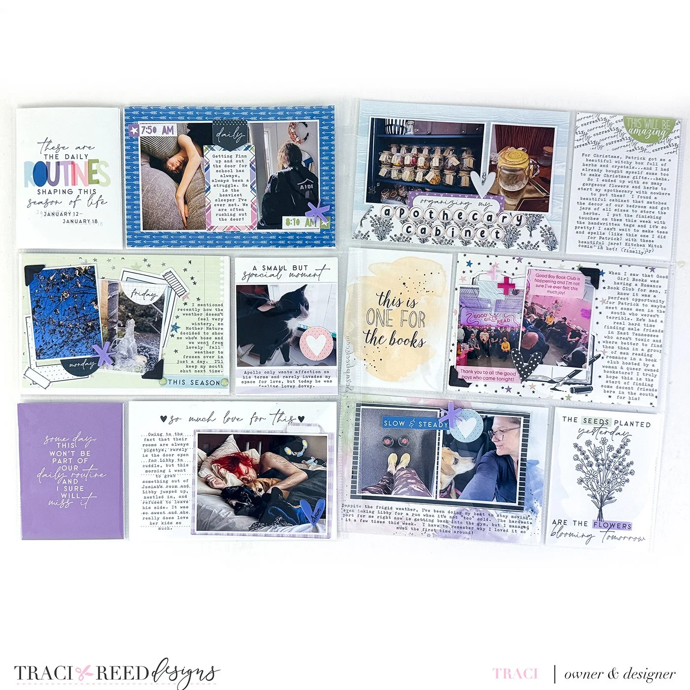 At first glance, Routines has a very distinct color story. Soft blues, purples, greens, and neutrals create a calm, steady rhythm that feels perfect for everyday documentation. What I wanted to explore was whether introducing a color that isn’t strongly featured in Routines, like the warm yellow from the Core Collection, would disrupt that rhythm or enhance it. The answer, happily, was the latter. The yellow card and a few coordinating stickers add just enough contrast to create visual interest without pulling focus away from the overall spread.