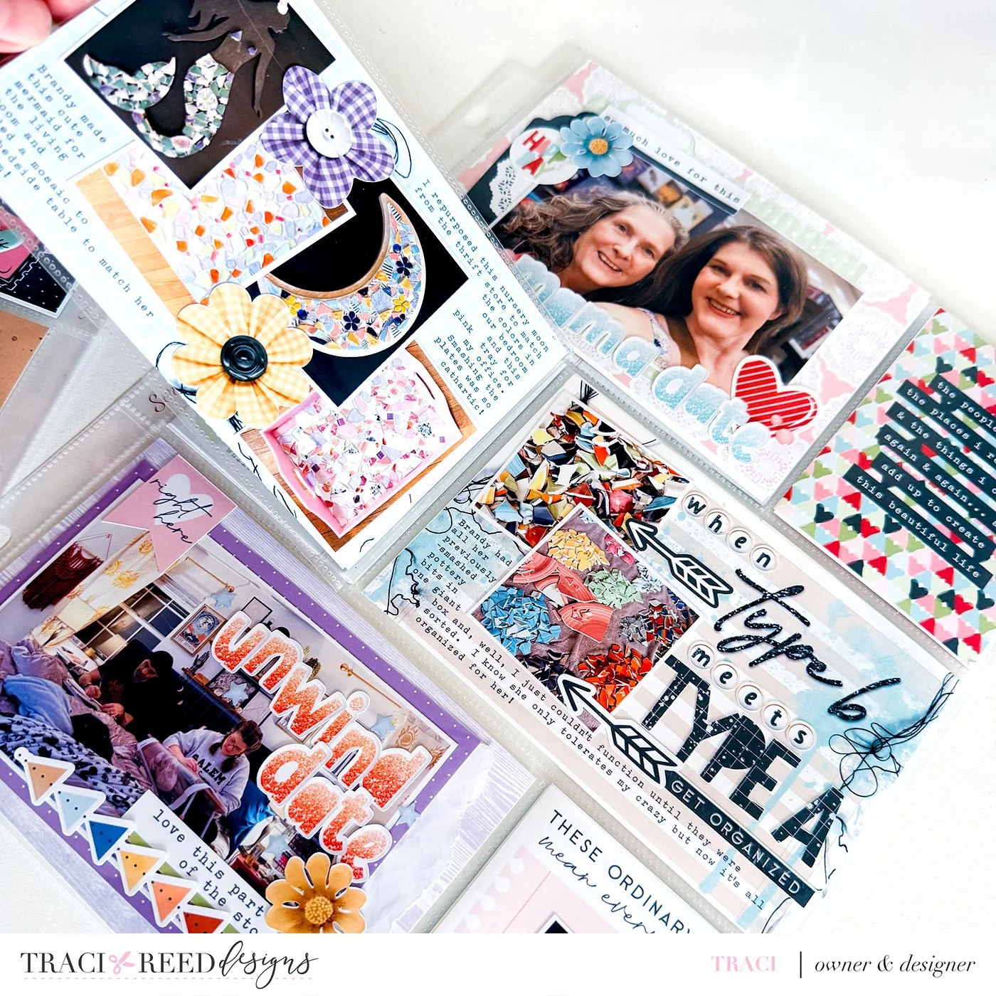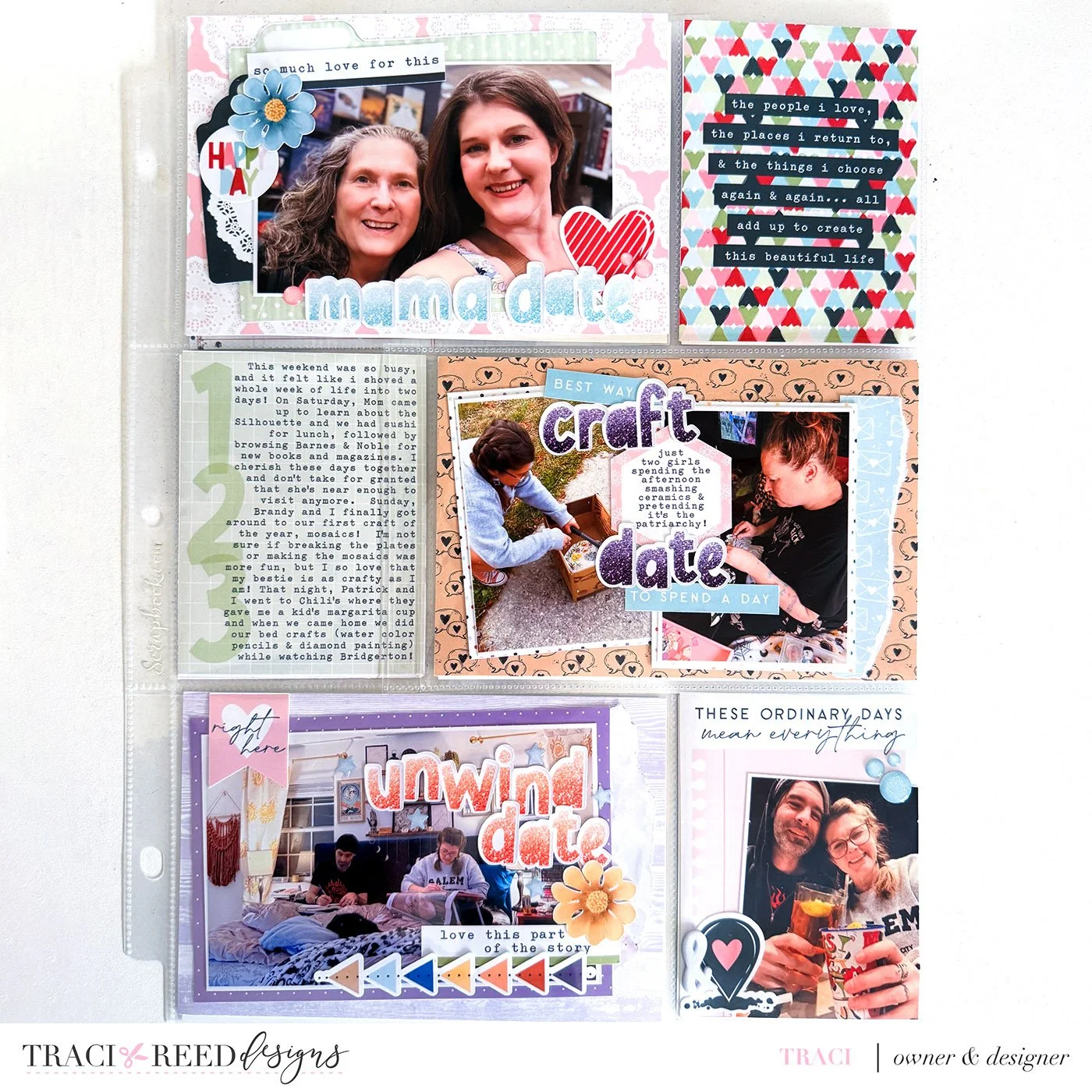 There’s also a flip-up element on the craft date photo that opens to reveal more of the story inside. I wanted to include a little more detail about that time together without adding another full pocket to the spread, so the flip-up gave me a way to tuck the extra journaling neatly into the layout.