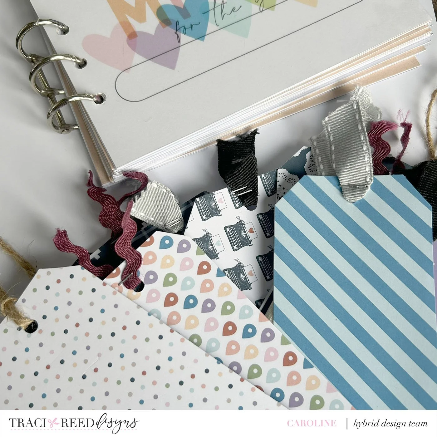 Once everything was in an order I liked, I added them onto rings before trimming my scraps into tags for those pockets. I stamped some prompts onto the cards to encourage some reflective thoughts in her busy times… added ribbon and twine, and called that it.
