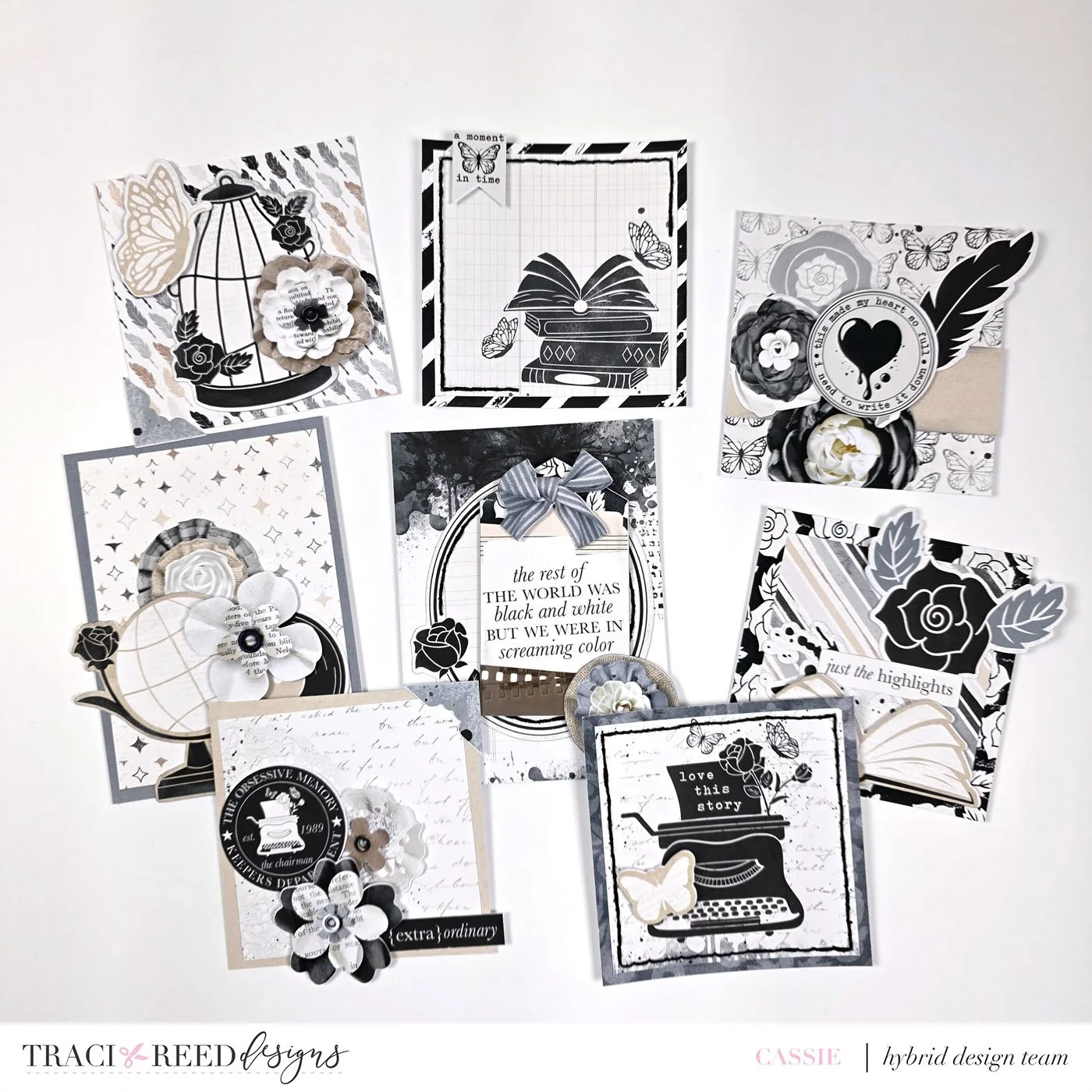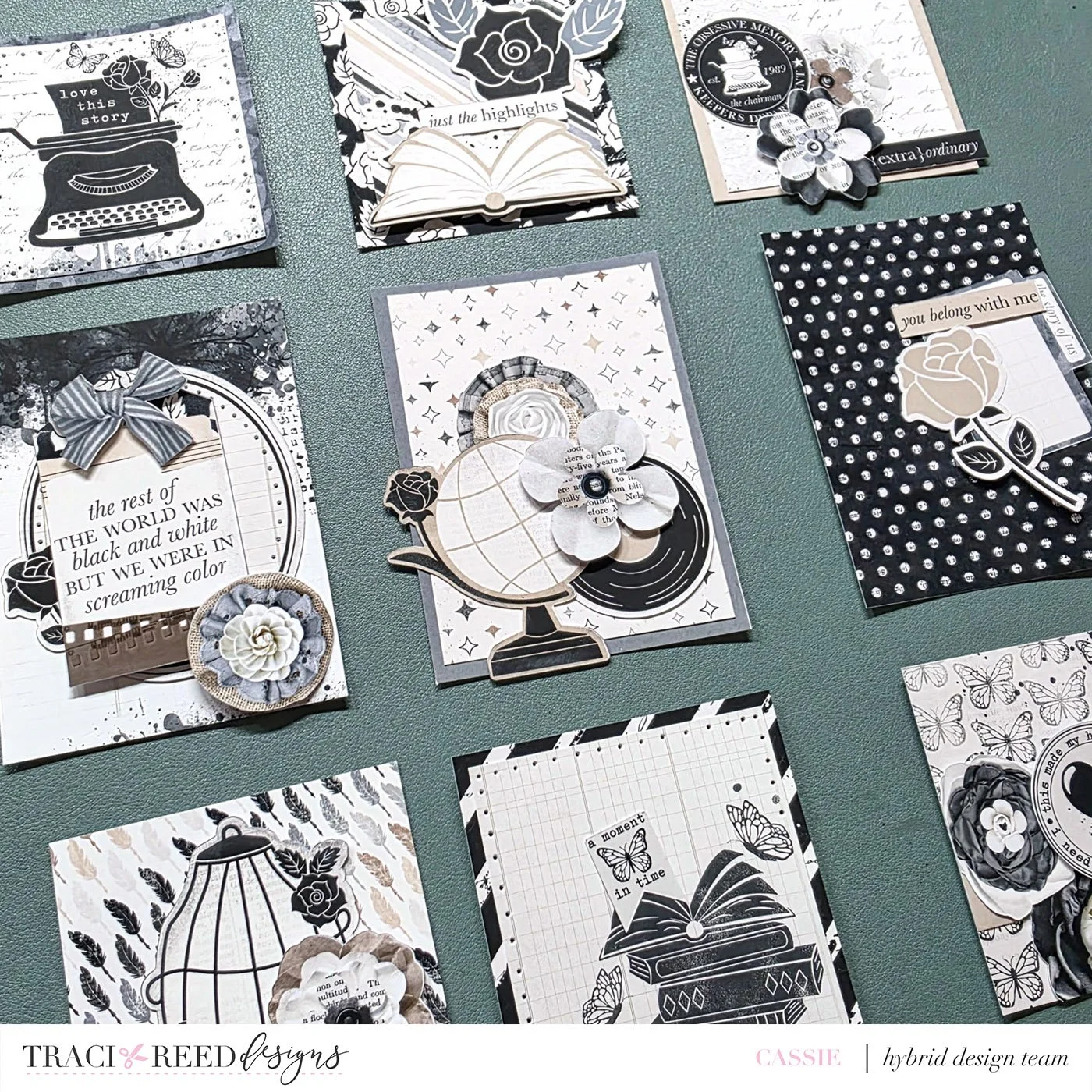 After selecting my favorite 9 cards, I laid them out in a grid pattern on my workspace. I love the versatility of a grid layout; it’s an easy way to keep things organized while leaving room for creative freedom. I then started adding die cuts and layered elements from the remaining cards. The goal was to create a harmonious balance and ensure that each card had its own unique flair.