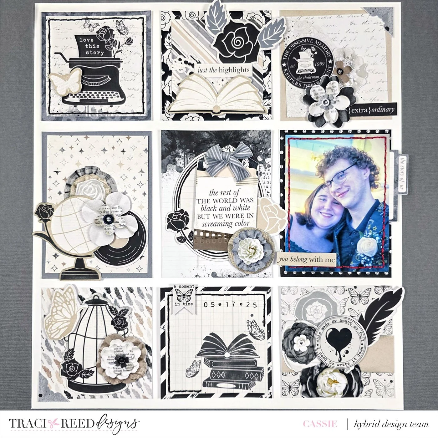 With all the cards decorated, it was time to bring the whole layout to life. I decided to add a photo to one of the remaining 3x4 cards, which would serve as the focal point of my layout. From there, I began arranging all the cards in a grid format on a piece of white cardstock.