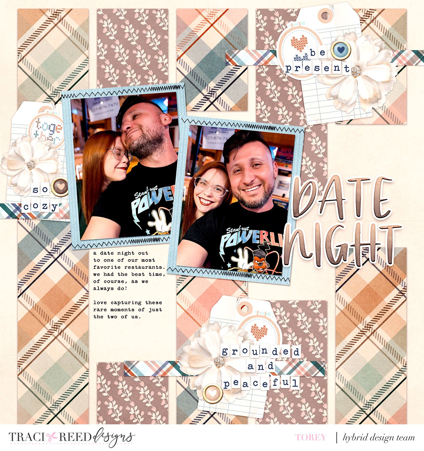 I had such a great time working with this sketch and challenging myself to use it in a way that still reflected my aesthetic as a memory keeper. I decided to use the Hygge Season collection because it’s a favorite of mine. Instead of pulling in lots of patterned papers, I chose one solid for the main background and just two patterns to alternate across the spread. This let the beauty of the sketch layout really shine while still keeping my pattern choices simple and I loved the final result! I finished off the page by using some Ellies and Stickers to build a few of the suggested element clusters and used this page to document a recent date night with my partner. ❤️
