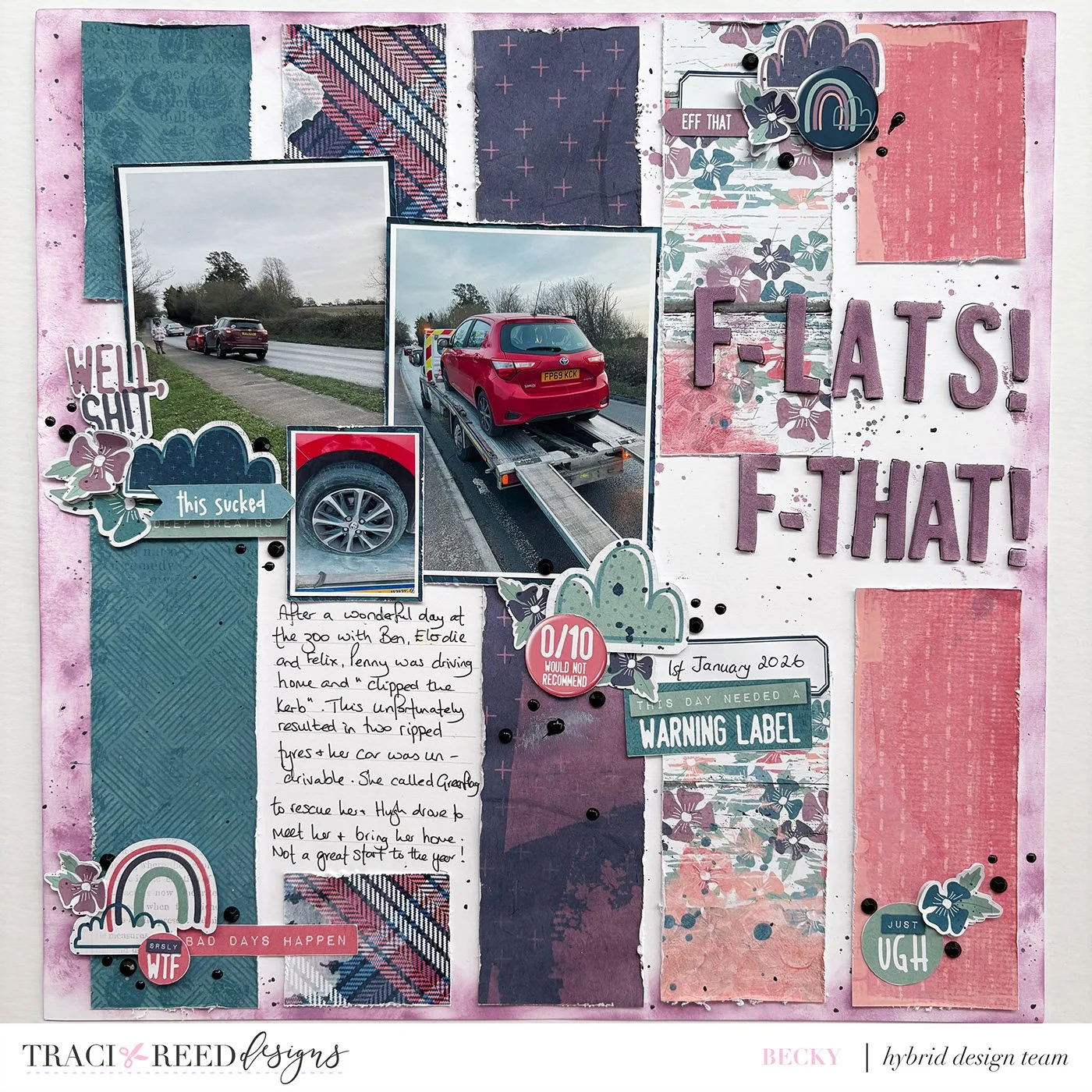 As soon as I saw this sketch I knew I had the perfect photos and the perfect collection for it. Tempest is a former free gift from 2023 and now a $5 sampler and is the ideal collection for scrapping those not-so-perfect moments such as your daughter writing off two tyres on New Year’s Day and needing recovering home! I love this sketch and stuck to it adding lots of the snarky and bad word bits and pieces. I chose a coordinating ink to edge my white cardstock and also added the same colour as splatters before adding my strips of pattern paper to the cardstock. Some enamel dots and Nuvo drops along with some foam letters for my title which I coloured with the same ink finished my layout off nicely! If you’ve not done hybrid scrapping before one of these $5 samplers is a perfect way to dip your toe in the water!