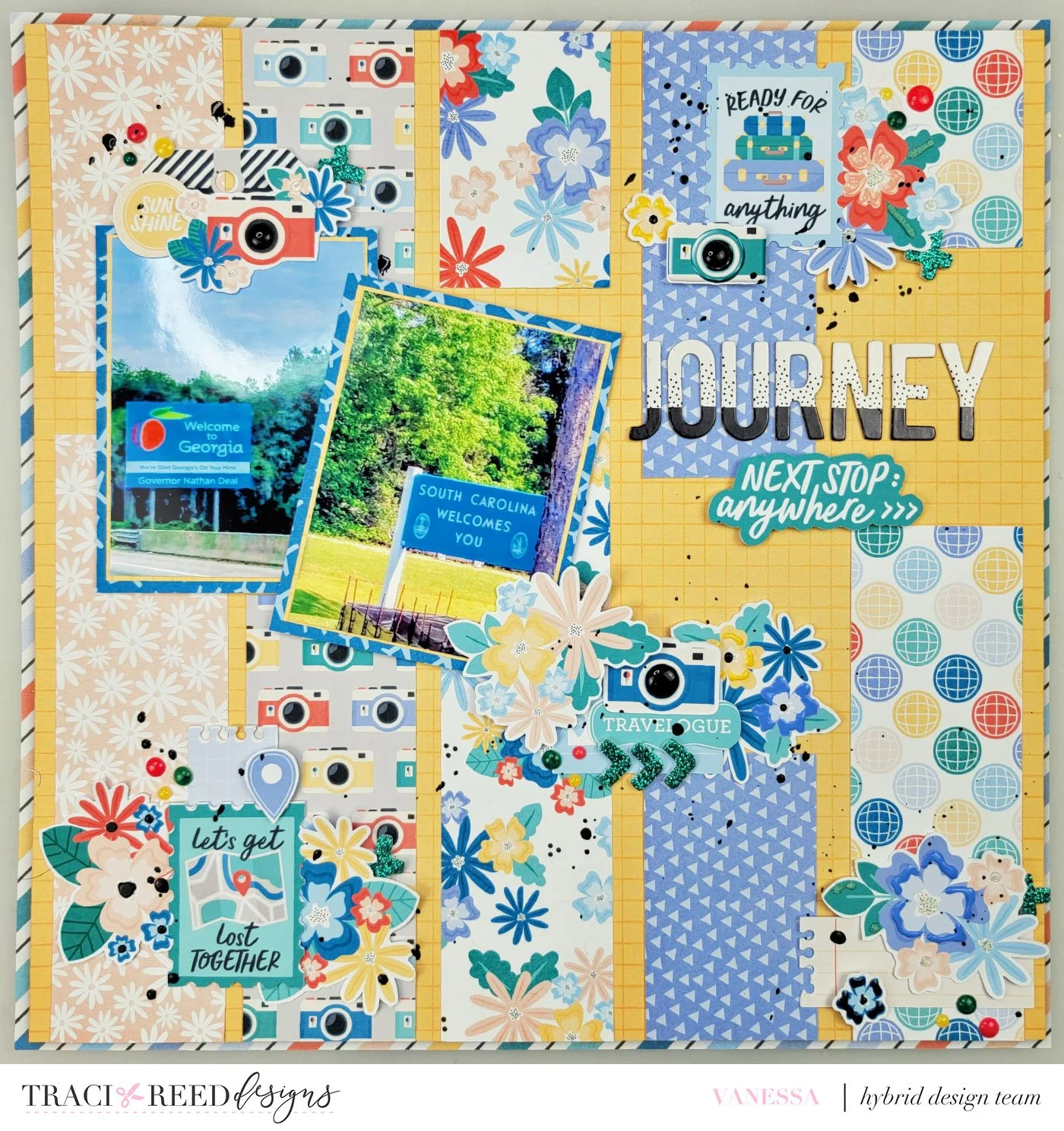 Sketches make creating a layout so quick and easy and this sketch today is perfect if you have scraps you want to use up or pattern papers you want to showcase. The strips of paper creating thebackground make this page come together so quickly and I love the mulitple simple clusters scattered thoughout the layout. I use the Wander and Wonder for my collection to document some travel photos. I love that I was able to use scraps from my pattern papers and lots of the amazing florals from this collection. The whole layout came together quickly and I love the results.
