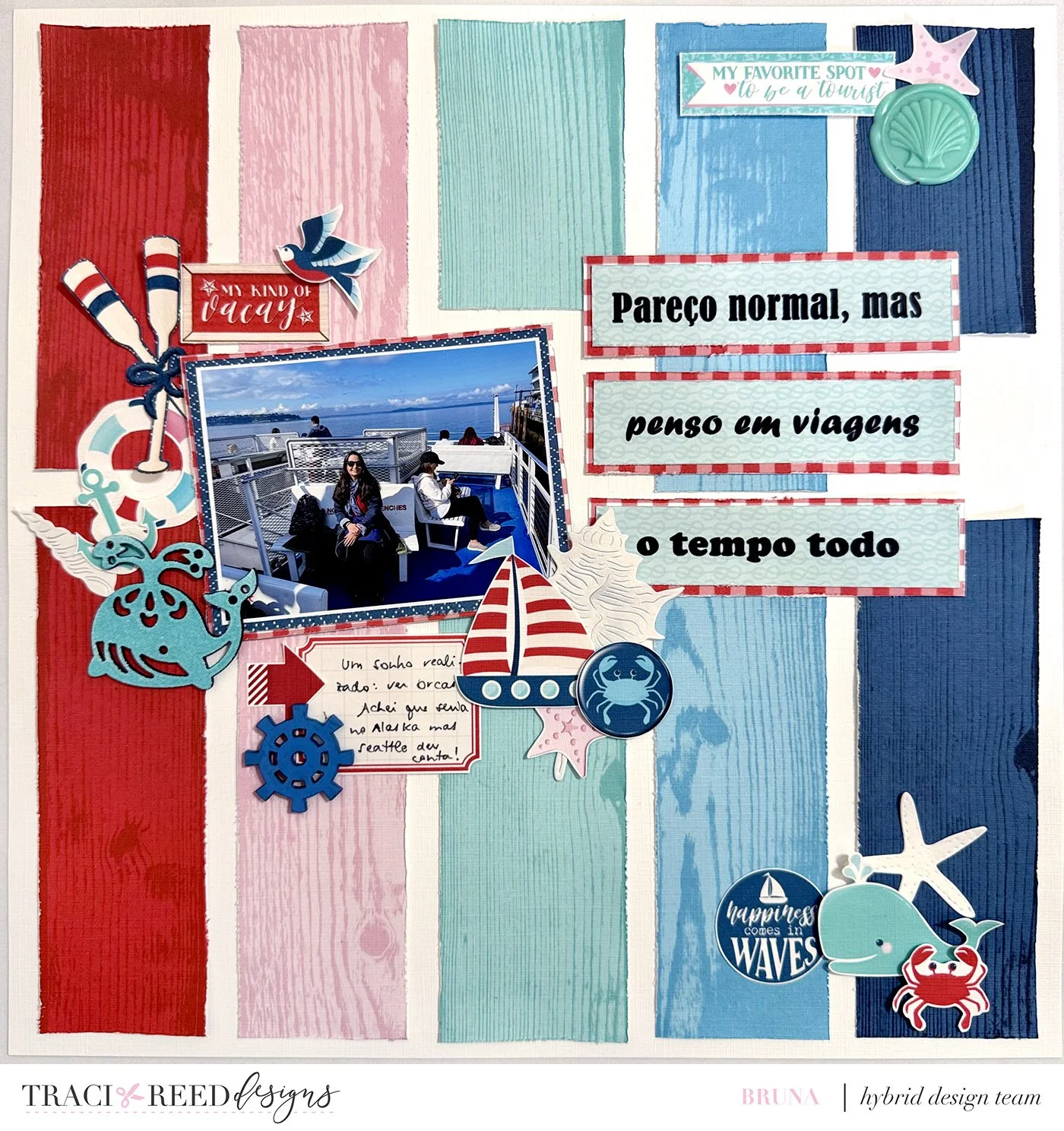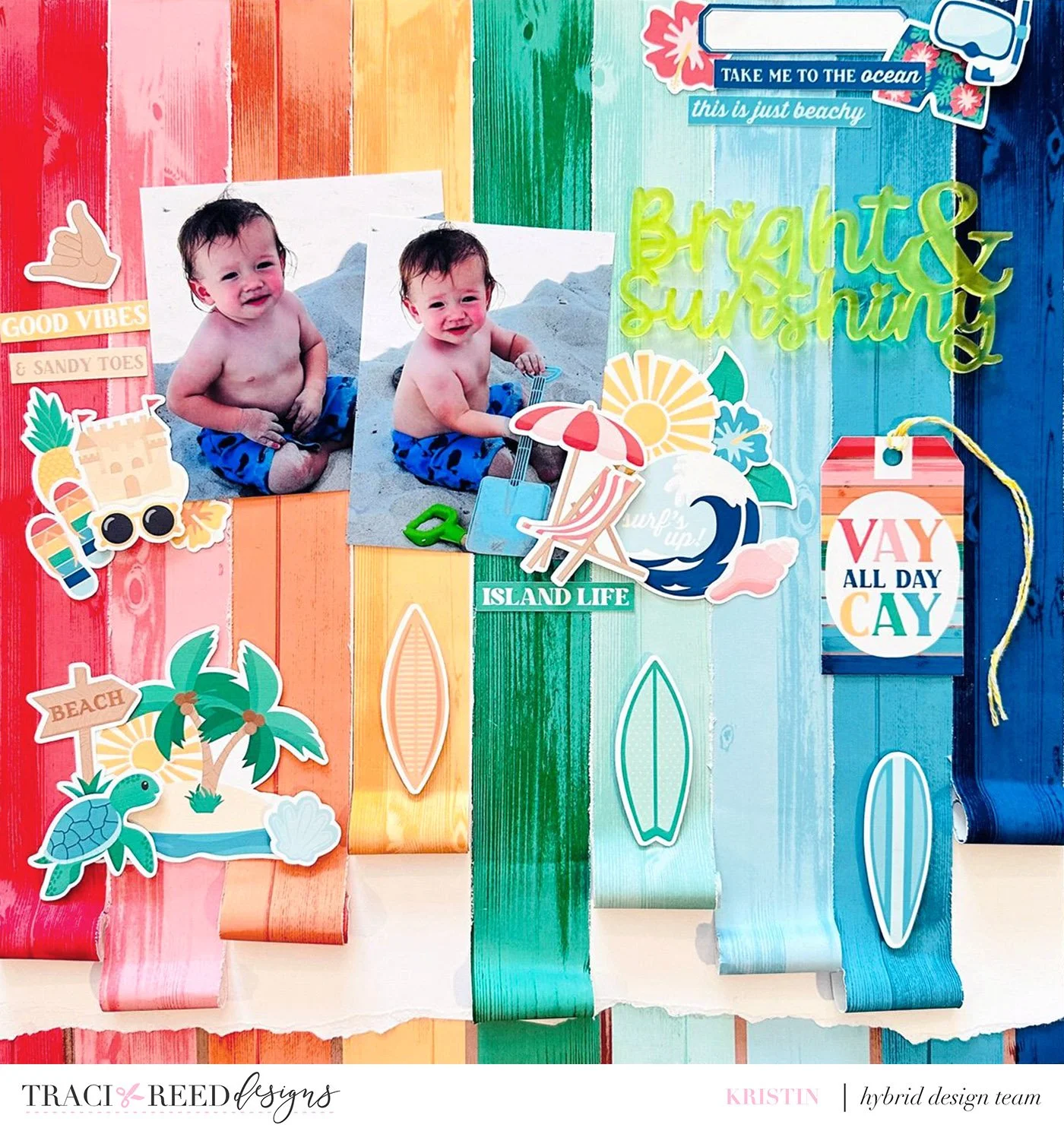 When I saw the sketch by Traci, I knew I wanted to use those gorgeous rainbow woodgrain papers in the Island Time collection. My home state had a pretty brutal winter with very cold temps and tons of snow, so I was craving a little warmth and I definitely got that from this collection! I chose a couple photographs of my younger son enjoying the beach. I adhered the woodgrain papers to plain white cardstock and I chose to curl up the papers to give a little more dimension. I ripped a little peekaboo area and had some more of the woodgrain paper peak out from underneath it. I added plenty of beach-themed embellishments and added a colorful yellow acrylic title to complete the layout. This layout was the perfect remedy for a case of the winter blues!