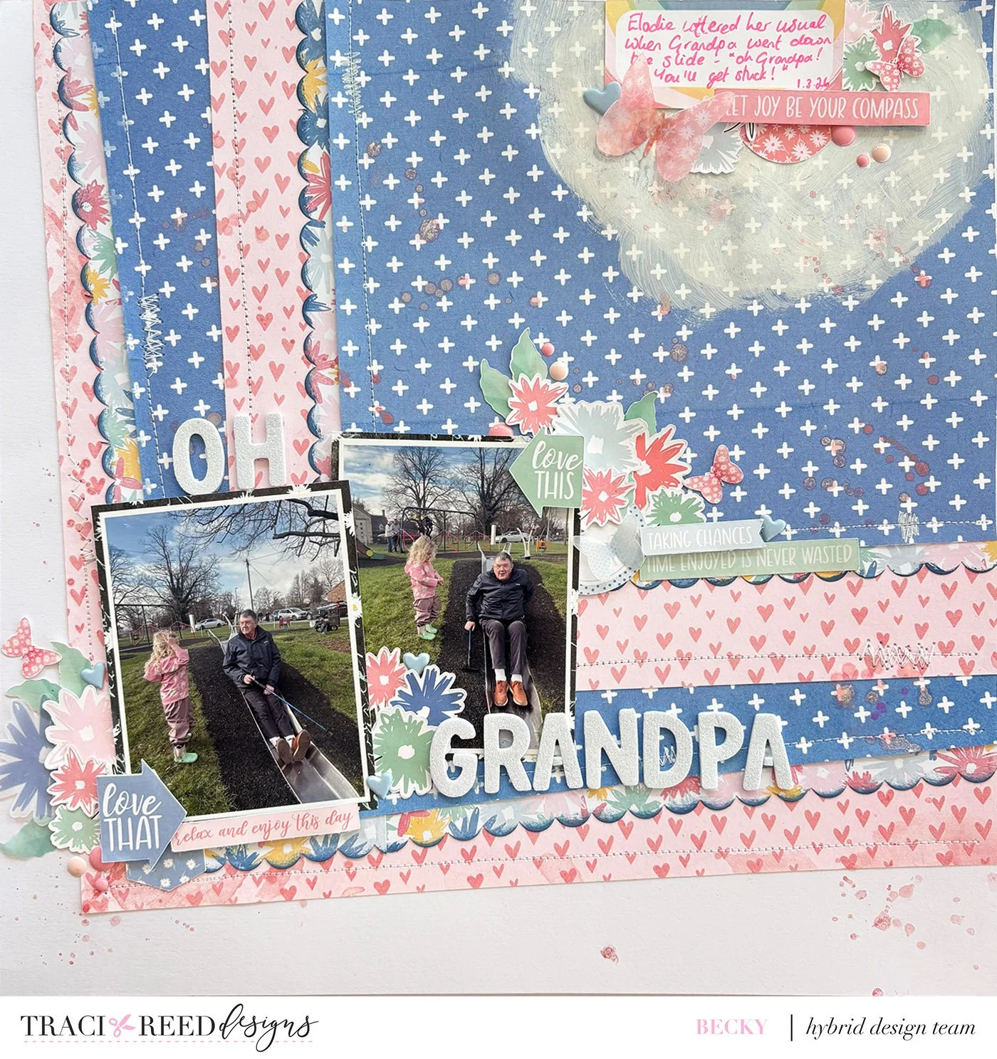 I was instantly drawn to the layered paper design in Traci’s Sketchy Sunday #73 template. It has such a dynamic foundation. To get started, I selected four different patterned papers along with a single solid paper to ground the layout. One of my favorite details is the scalloped edging that borders two of the paper layers as it creates a beautiful sense of separation while still keeping everything cohesive and flowing together.