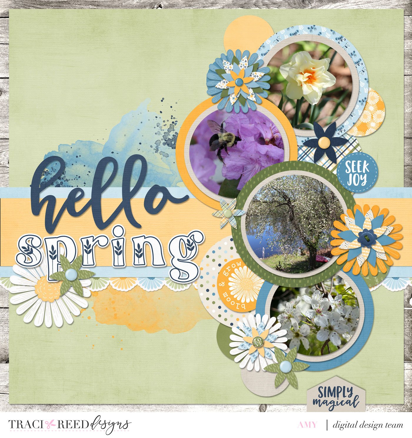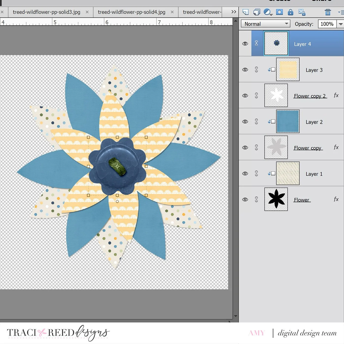 As I write this, we are still digging out from last week’s blizzard that dropped two feet of snow on our area. The world outside is cold and white and very much still winter. This layout is my attempt to bring some lovely, bright flowers into existence. The Traci Reed Designs Wildflower kit is your go to for all things SPRING!! This adorable kit inspired me to create a tutorial to use digital paper in a different way. I created these fun flowers using the beautiful papers in Traci’s kit.
