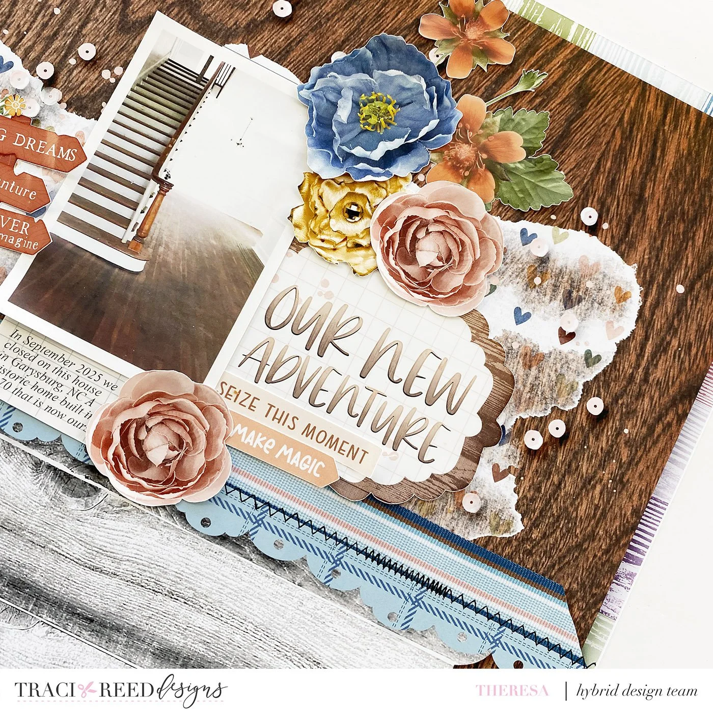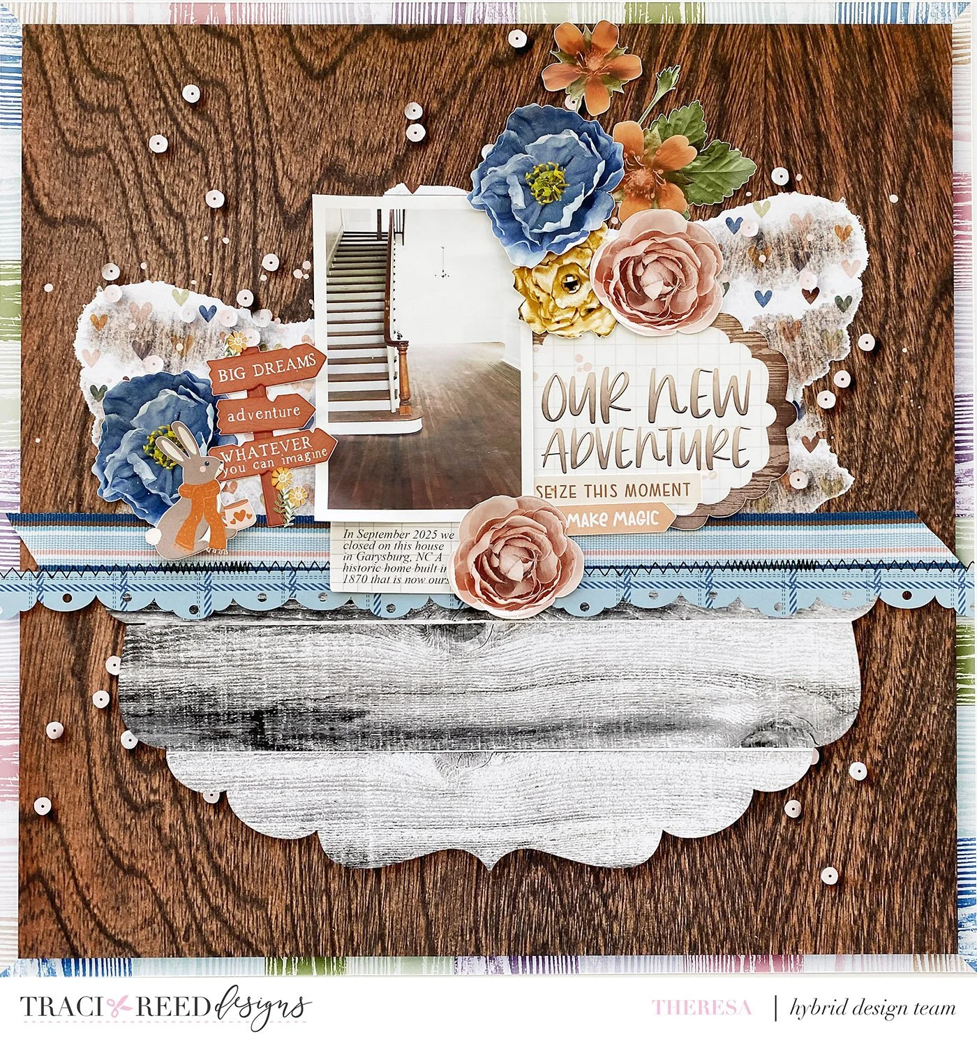 Hi friends, do I have a super fun challenge for you! Today we are creating with all the fabulous woodgrains in the Traci Reed Designs collections! There are so many beautiful wood grains, including patterned papers, alphabets, backgrounds, embellishments, that I know you will love this challenge This is my layout I will be creating to showcase some of these amazing woodgrains!